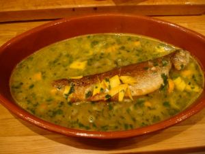 Add the two juices, the salt and pepper and the parsley. Let this simmer for a few seconds before carefully pouring the contents of the pan over the trout.