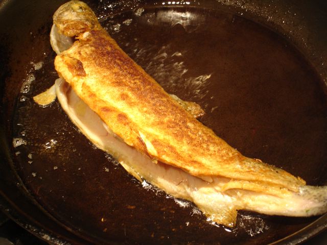Spread the chick pea flour on a large plate and turn the trout in it to coat well. Tap the excess flour off the fish.
