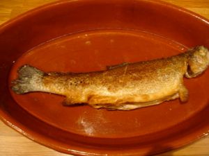 Heat the oil in a large frying pan and fry the trout for about 5 minutes on one side and a minute less on the second side. Then lift it carefully out of the pan and into the marinading bowl.