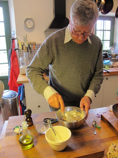 Add a scant tablespoon of olive oil and the vinegar–blending well.