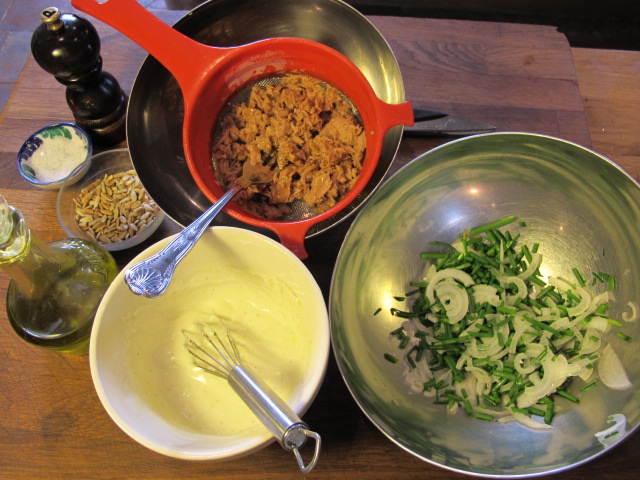 Meanwhile, empty the tuna into a bowl, add the herbs, the spring onion, the sunflower seeds, a scant tablespoon of olive oil and a twist or two of pepper.