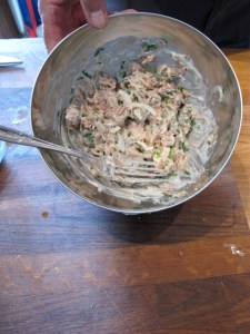 190 gm tin of tuna–drained and broken up with a fork–(the amount of tuna is a matter of choice; I reckon about 75 gms each)