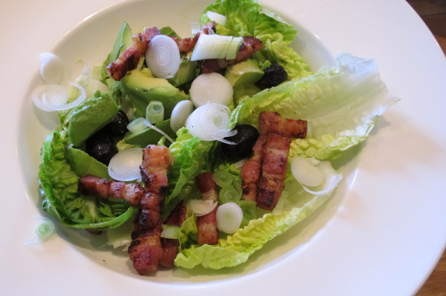 Meredith arrived with ripe avocadoes and a firm penchant for an avocado salad with spring onions, lettuce, lightly sautéed bacon bits, a few juicy black olives and a poached egg on top—-AND she was offering to make it–no contest, win-win, I thought!