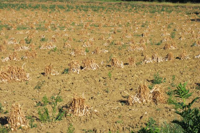 Our local garlic [l’ail rose, pink! ] harvest is almost over and the fields are stacked with tresses waiting to go to the barns for drying.