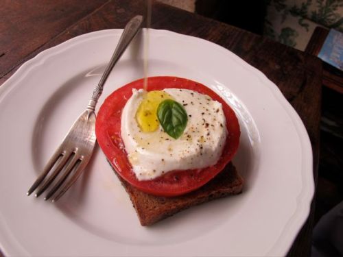 After she’d dutifully eaten half a plateful of the salad, she got up made a piece of toast–with the organic rye I eat–sliced a large wedge of very ripe tomato, placed it on the toast with a pinch of salt and drizzled some of our tuscan olive oil on it.