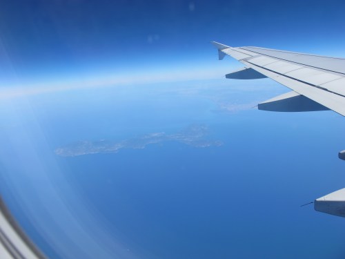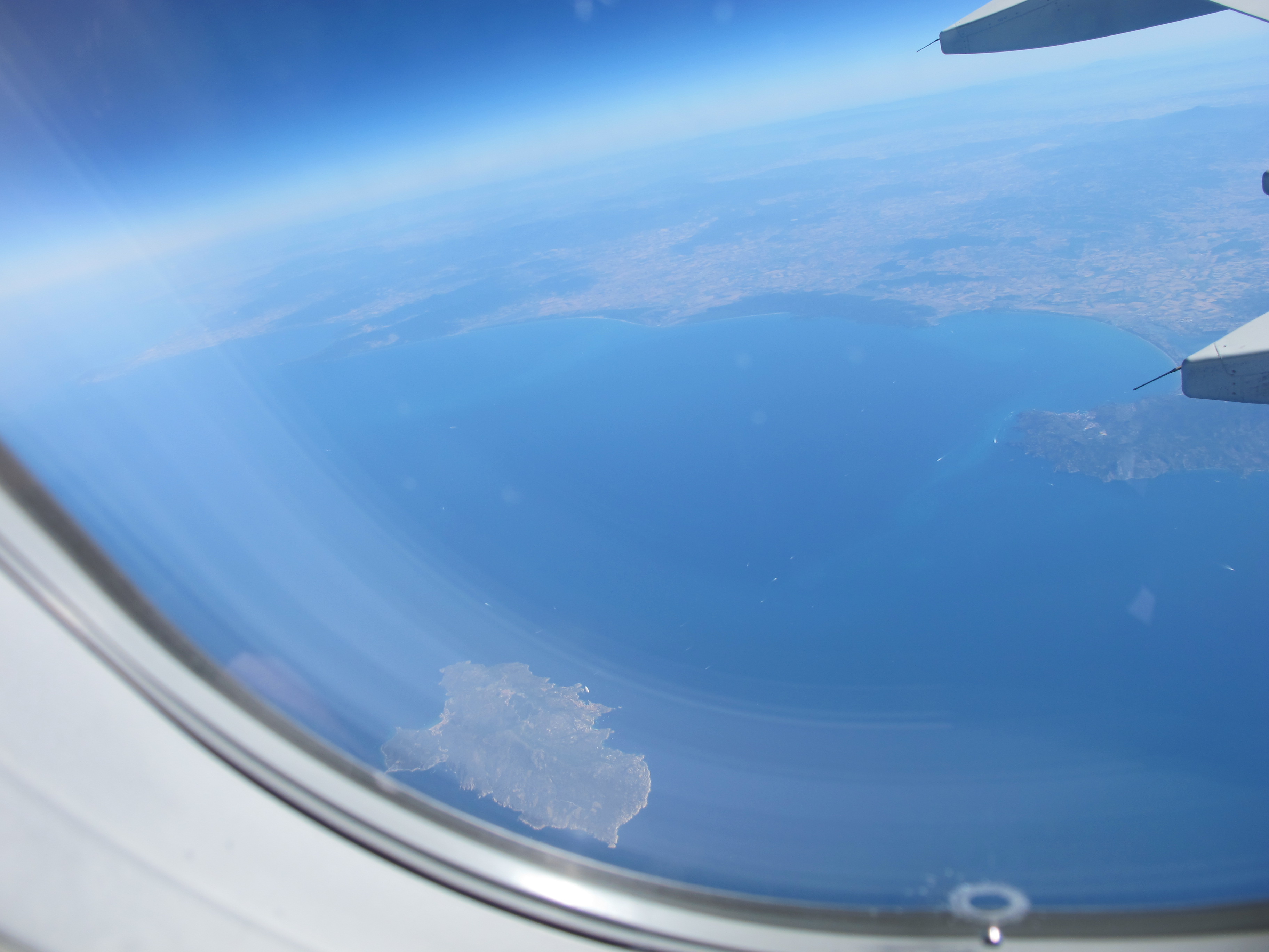Meredith’s shot of the mountains of central Corsica–soon after taking off from Toulouse and heading east on our secret mission with a Poldark connection…