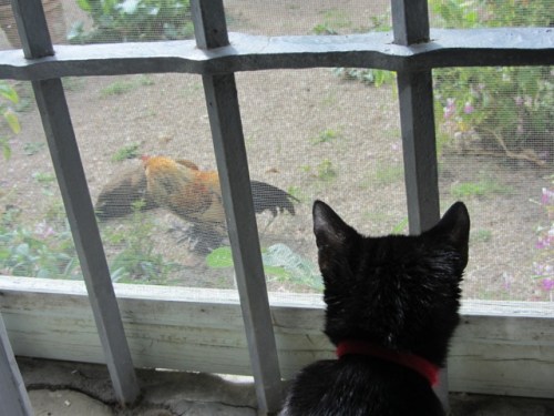 Is that your cockerell I spy through the window in one picture? Is he keeping his hens in order and strutting his stuff – and have you got used to his rallying sounds?