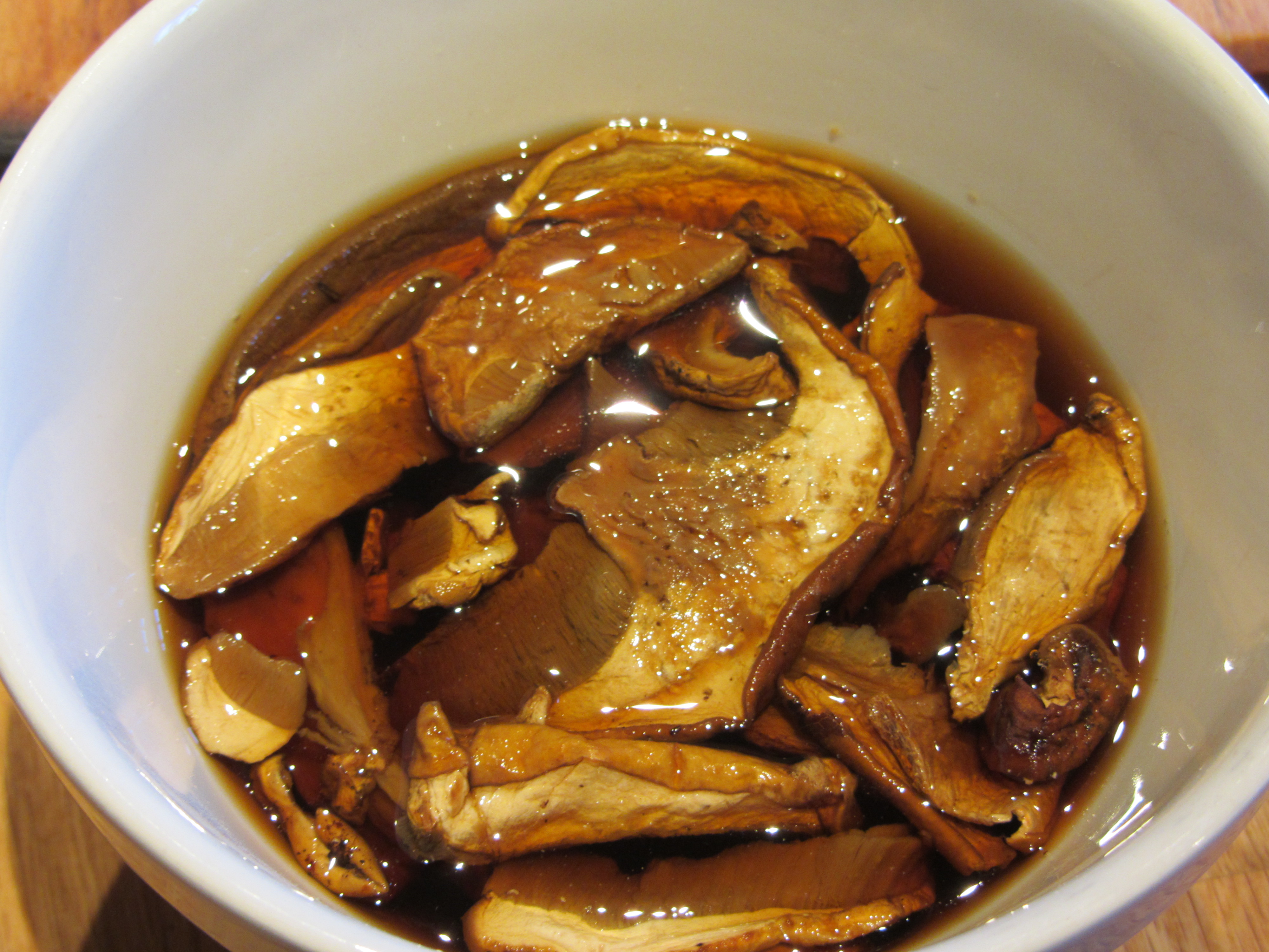 - Put the dried mushrooms in a bowl and pour over 200ml hot water–leave to soften for 20 minutes.
