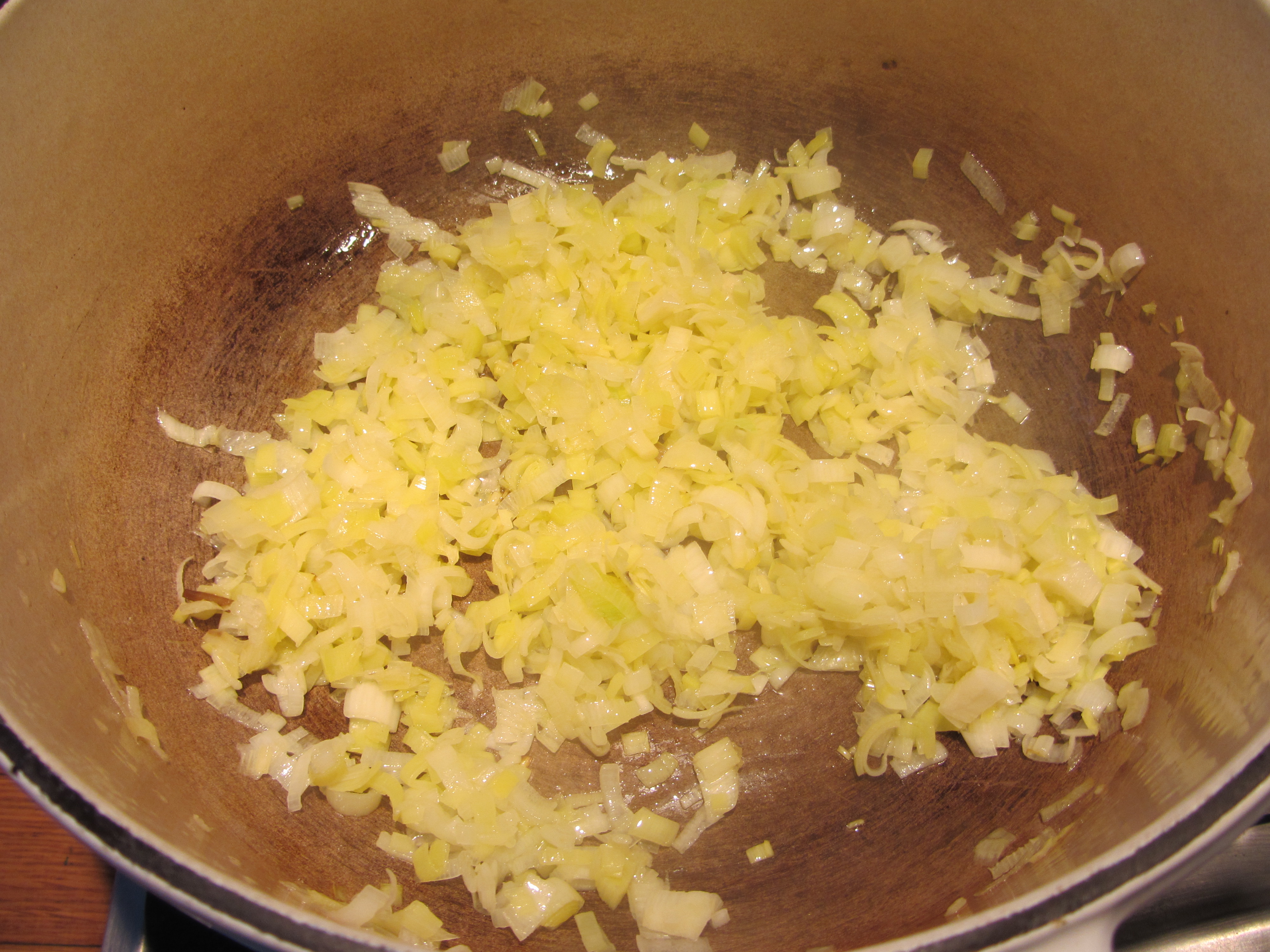 - Heat the last tablespoon of oil in a medium casserole (the one in which you will serve the risotto) and sauté the leeks over a medium heat until they soften and colour a little.