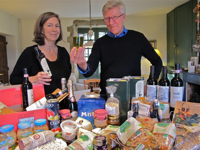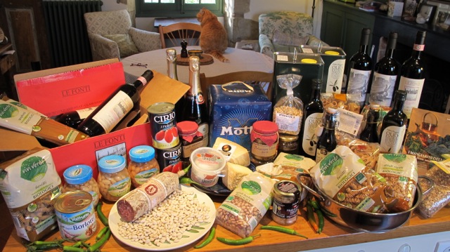 pecorino cheese, borlotti beans, prosecco wine, chianti classico, wholewheat pasta, Helen’s homegrown green chilis, new season olive oil, dry white cannellini beans, dried chickpeas, buffalo mozzarella, dried wheat berries, Cirio tinned tomatoes, parmigiano reggiano, wild boar salami and delicious, unexpected gifts from our friends Beatrice and Maria Gracie, whom we met in Florence–
