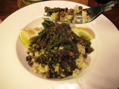 inspired by a recipe in Rose Elliott’s Bean Book that combines lentils and spinach (and remembering the pound plus of beautiful organic spinach in the fridge)–I gleefully took it down last night.