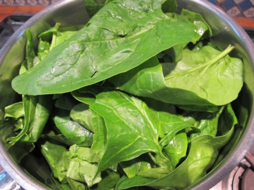 - While this is proceeding find time to put the spinach in a large saucepan with a couple of pinches of salt snuck in between the leaves–no extra water is needed.