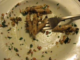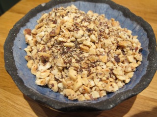 Hazelnuts roasted are particularly more-ish. Mixed with olive oil, chili and garlic and served, as here, with nutty wholewheat pasta, they are irresistible!