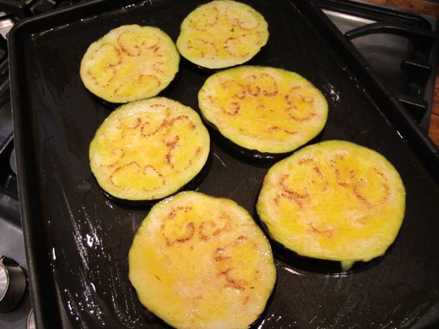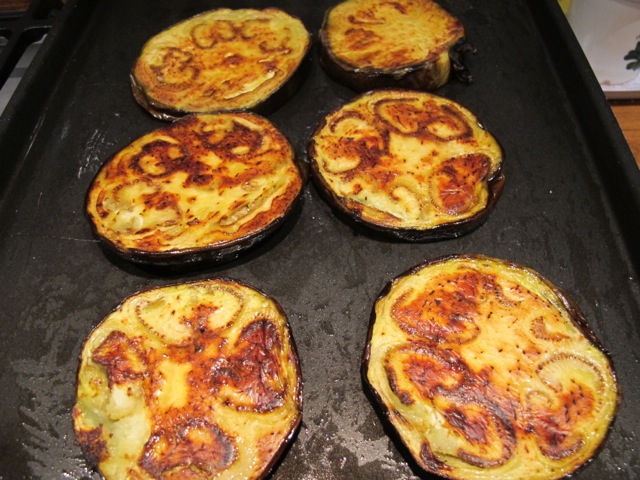 When the aubergines are nicely browned on both sides, remove from the oven.