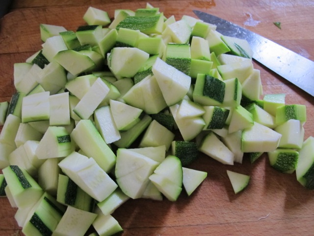 To prepare the courgettes–peel them in stripes, quarter them lengthwise and cut them in dice.