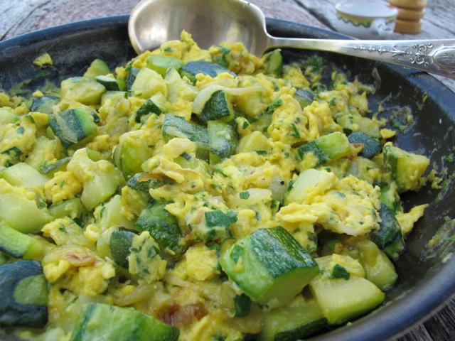 More scrambled eggs than omelette or frittata–it an attractive way to use some of the courgettes queueing up to be used as the glut develops.