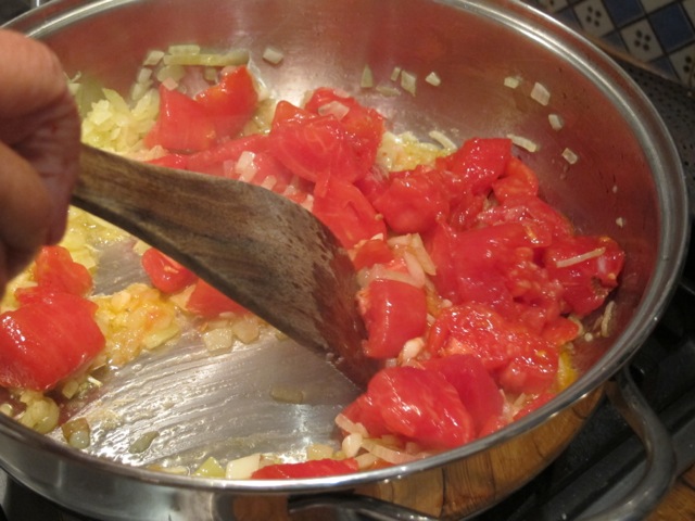 Add the tomatoes—which you have broken up–with the spices, herbs and salt.