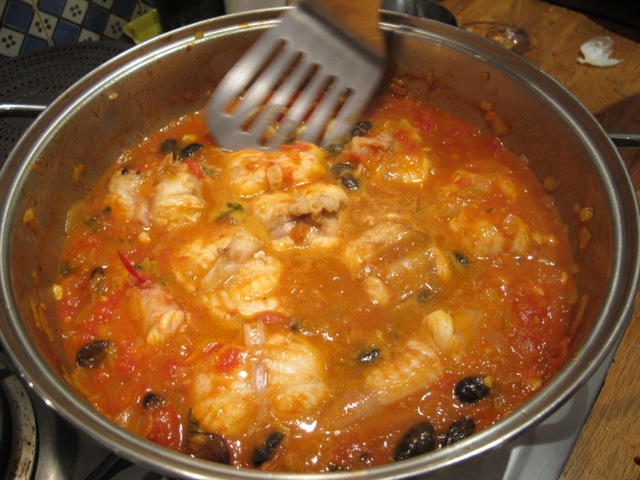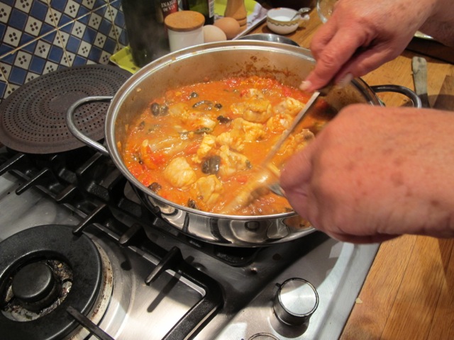 They were cooking this handy dish from the proofs of my NEW book, Healthy Eating for Life (due out in January 2014): Monkfish with black olives in a smoky paprika tomato sauce.