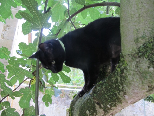 He continues on, jumps up on the table under the window to the courtyard–looks out briefly and exits through the grill.