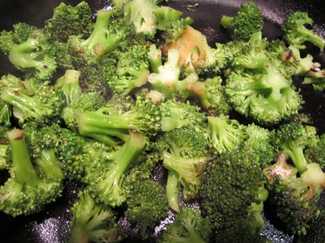 A couple of nights ago, I’d mis-timed the broccoli; it was ready too soon–so I drizzled it with olive oil, seasoned it and sautéd it a low flame to keep it warm.