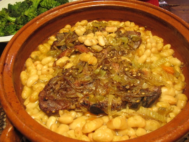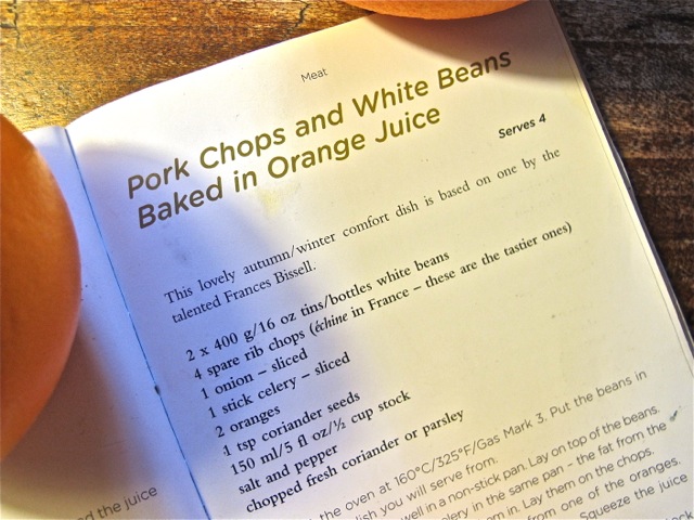 “Ah!” I remembered a friendly family butcher (husband and wife) nearby whom I occasionally frequent–and I recalled a one-pot recipe in Delicious Dishes that calls for spare rib chops, white beans and oranges. See recipe below….