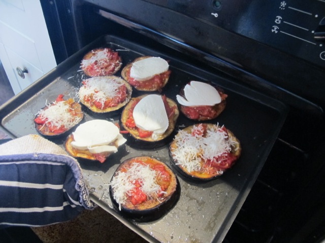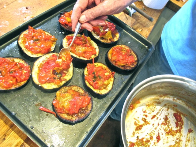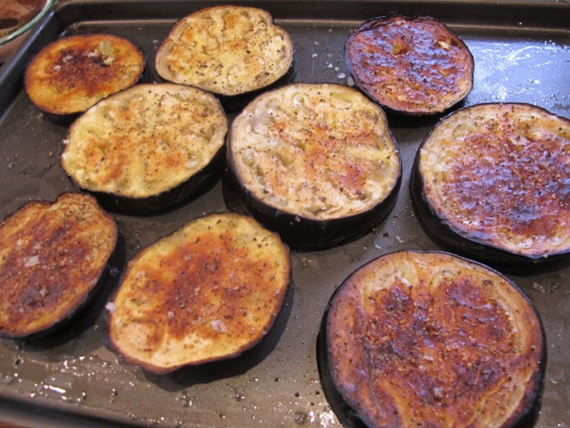Put the tray in the top of the oven and cook for about 25 minutes (check at 20 minutes, but the aubergines profit from a little singeing–and they must be soft).