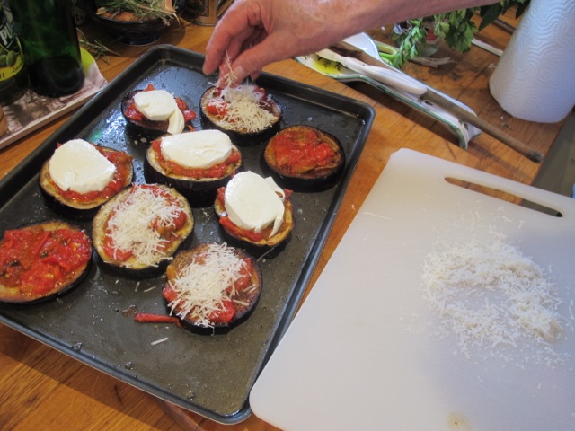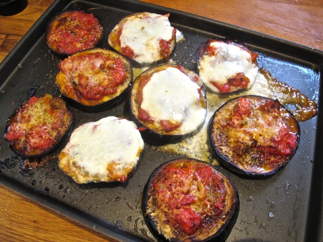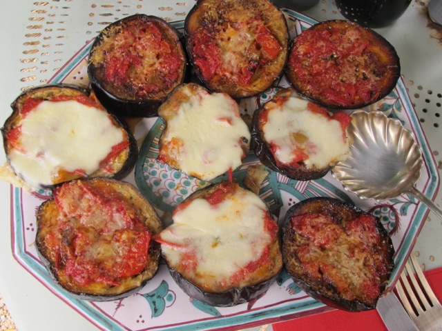 Thick slices of in-season aubergine softened in the oven at a high temperature then topped with ripe tomatoes cooked with garlic, a little chili and a slice of mozzarella or grated parmesan.