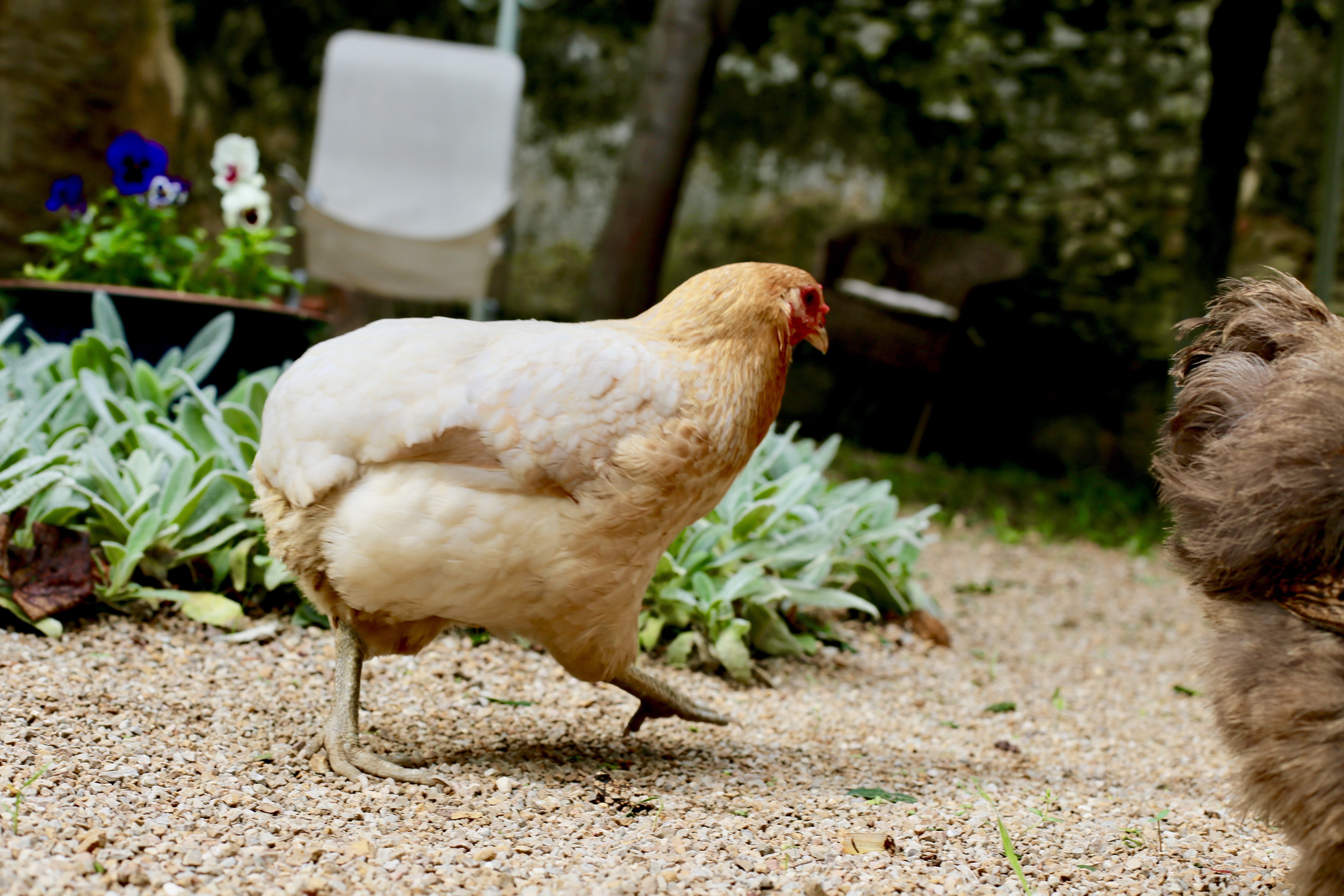 Lucette is a “rumpless” hen–an Araucana–who is supposed to lay BLUE eggs–not that we’ve seen any.