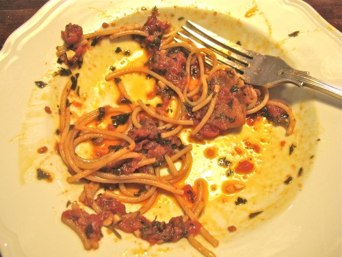 I see they featured just over a year ago with chèvre(goat’s cheese); todays’ will be with the thinnest slivers (easier to do than say fast!) of garlic and anchovies, melting into the tomato juices.