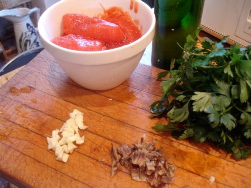 - Fill each half with tomato pieces, three or four slithers of garlic and an anchovy fillet on each.