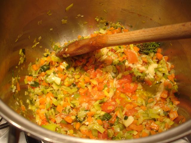 - Sauté the onions and garlic gently in the pan until the onions soften and turn opaque; take care not to let them burn on the bottom of the pan.
