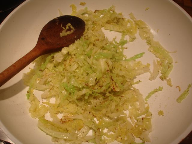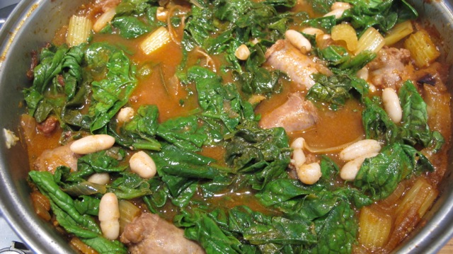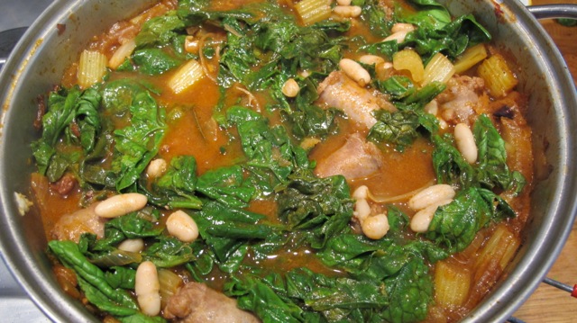 - Spread the greens over the top of the dish and leave them for ten minutes to start dissolving into it. (Cover the pan if you feel the need).