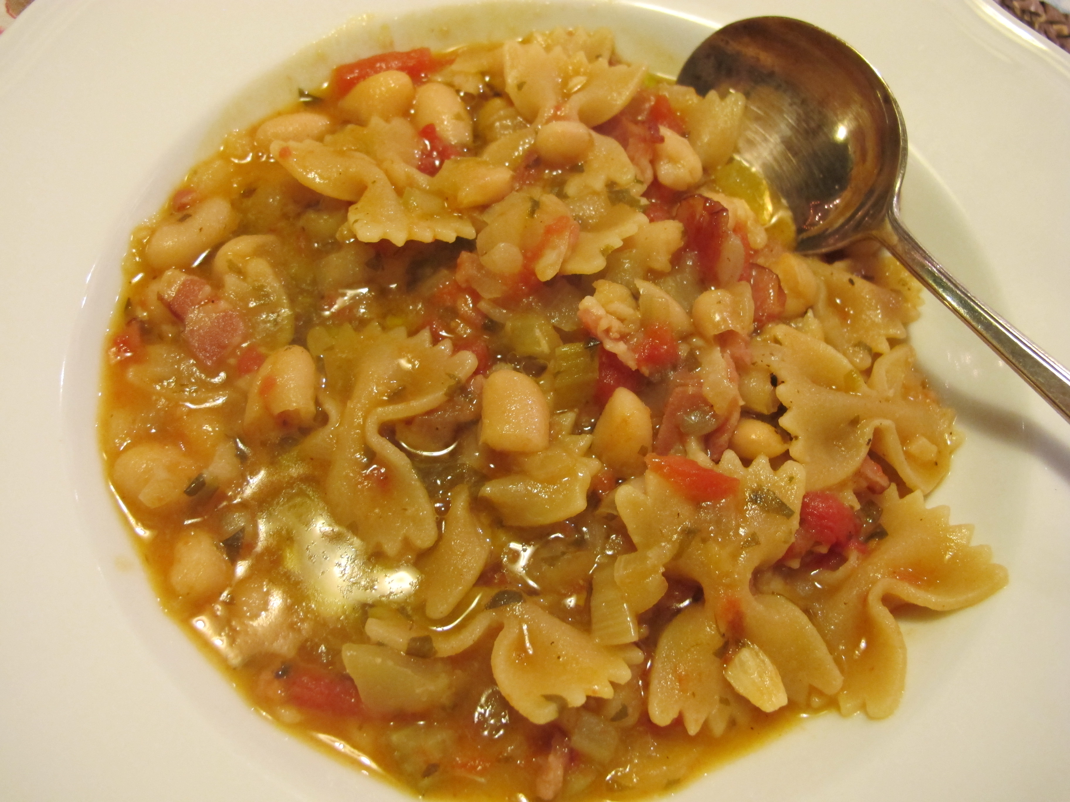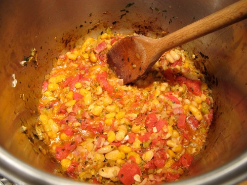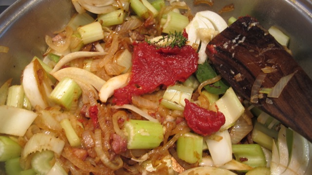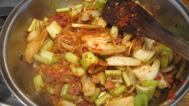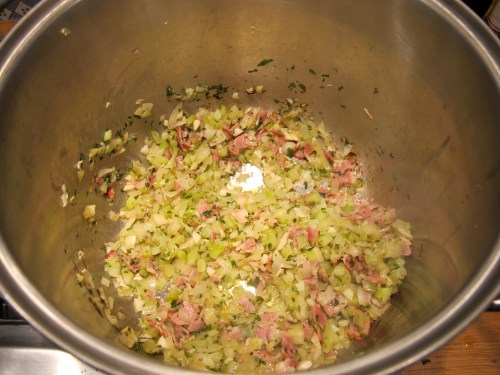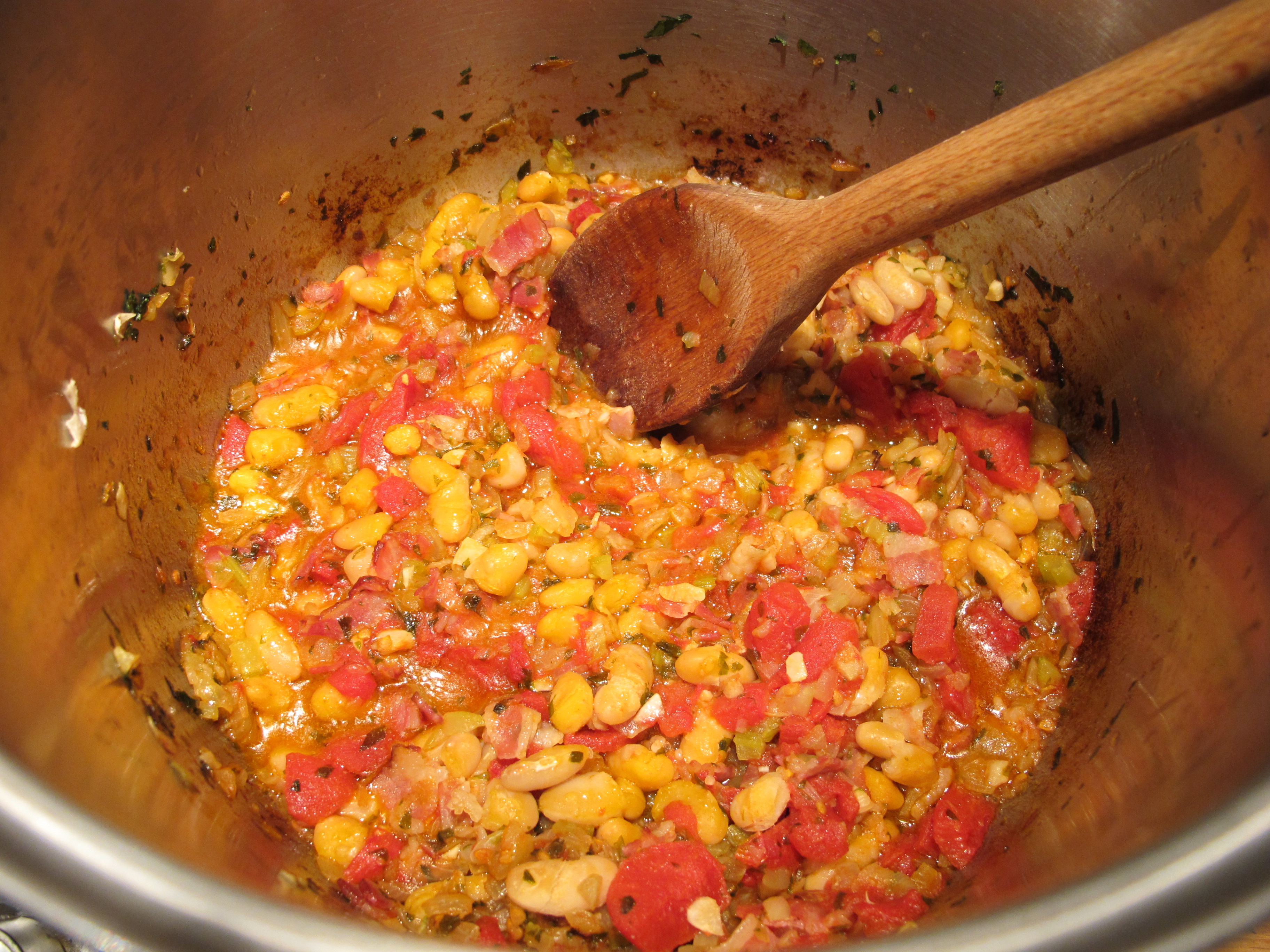 - Sauté the sausages and bacon in the olive oil for 10 minutes in a pan large enough to hold all the ingredients.