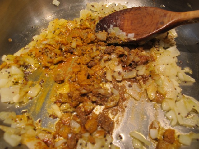 - When they start to pop add the onions and garlic, mix them in and sweat them until they soften and begin to colour.