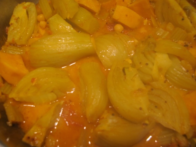 3 fennel bulbs–outer leaves removed, cored, cut in half vertically and each half cut thrice (i.e. six pieces in all–the ones in the photo are a tad too large)