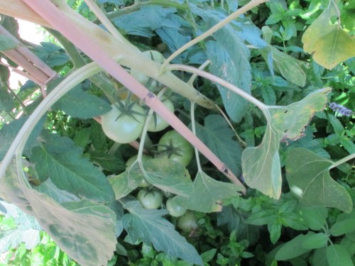 They were followed, closely, by two strong tomato plants–the real thing rather than the tiny cherry variety that pop up everywhere–with big green bunches ripening soon (we hope!).