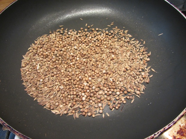 - Dry roast the cumin and coriander seeds in a small pan until they begin to colour.