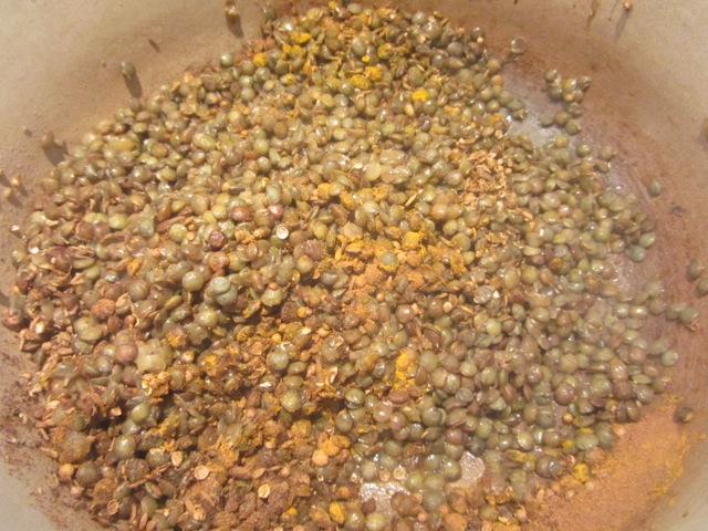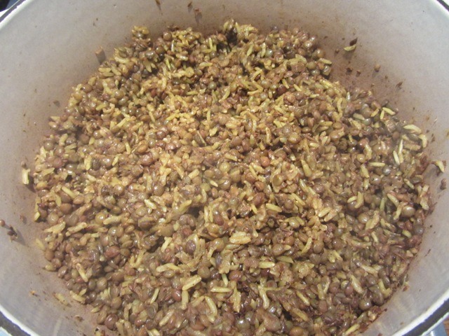 - When the lentils and rice are cooked fold in the onions–leaving some to sprinkle on top with the parsley or better still the fresh coriander.