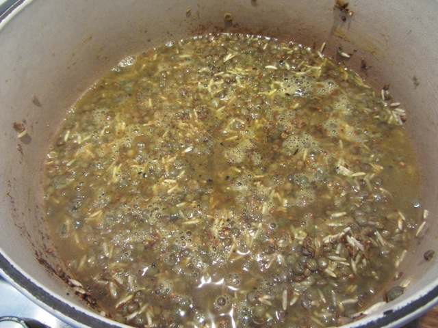 Soaking the brown rice beforehand helps it to cook more easily in time with the lentils.
