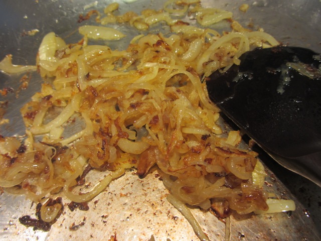 - As it cooks heat two tablespoons of olive oil in a pan and fry the sliced onion slowly until it colours and crisps a little.