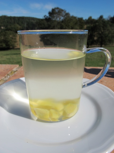 Ginger infused in hot water–just that–is delicious and good for relieving the symptoms of colds.