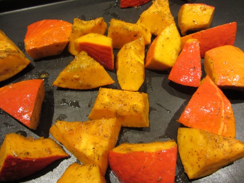 Roast in the middle of the oven, for about an hour and a half–(the time depends on the size of the chunks)–so it comes out nicely charred on top.