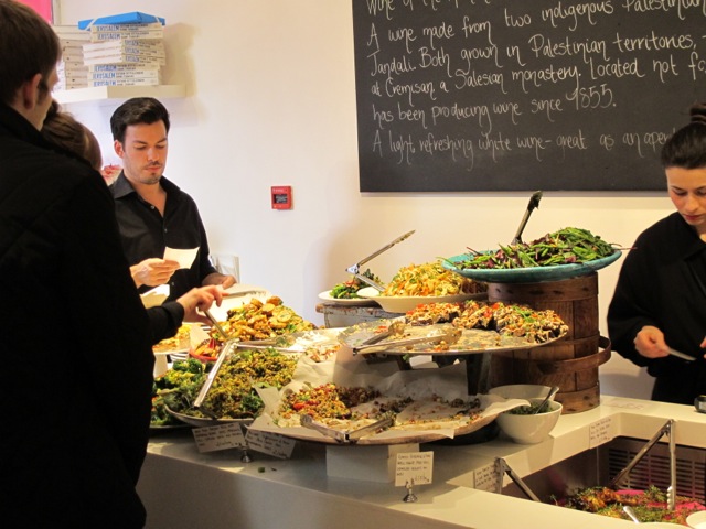 We passed the time staring at the heaving counter of prepared salads, trying to make up our minds what to eat–a mouth watering, morale-boosting exercise!