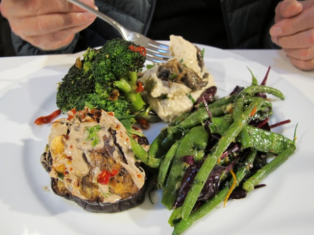 top left to right: char-grilled broccoli with chili, butter bean hummus with caramalised red onions, green beans and mangetout with red salad leaves, grilled aubergine rounds topped with tahini!