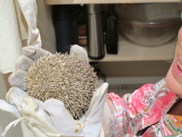 We cleared the cluttered space and Meredith gently managed to grasp him, protected by a pair of tough gardening gloves.