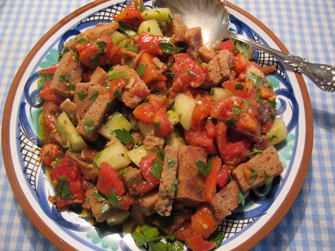 Back then I made it with roughly torn pieces of stale white ciabbata bread and sun-sweet tomatoes bursting with juice, assembled an hour or so before eating, dressed and turned over to let the juices do their work melding the oil and garlic and softening the bread.