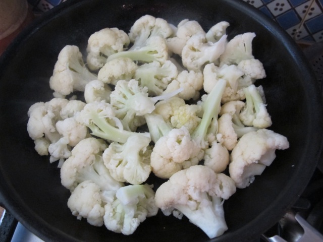 Heat the olive oil in a 26 cm (or 10 inch) frying pan. Brown the cauliflower in one layer on one side for a couple of minutes (no need to turn them to brown them completely).