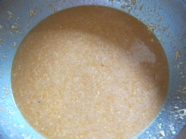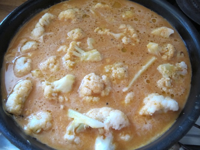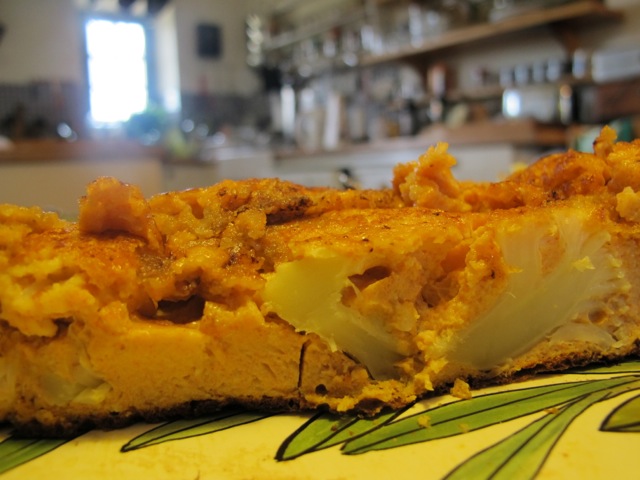 Pour the eggy mix over the cauliflower–shake the pan a little to get an even distribution of cauliflower.