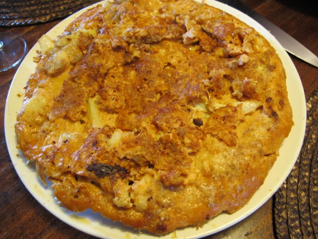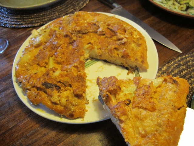 I laid a flat plate, roughly the circumference of the pan, on top of the frittata then with my left hand on the back of the plate and holding the pan’s handle with my right hand I flipped the whole thing over, then slid the frittata back into the pan to briefly brown the top.