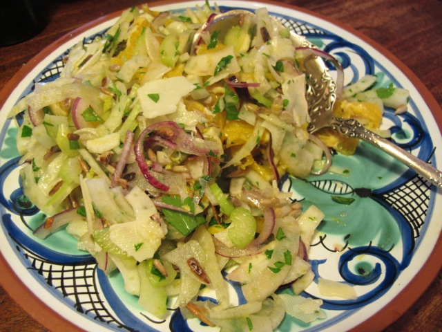 I made the fennel and orange salad from my new cookbook, Healthy Eating for Life, to contrast the blousy smokiness of the frittata.